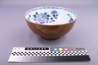 DescriptionBowl has rounded sides on a straight foot. Exterior is a brown glaze, interior is white with blue underglaze design of flowers and geometric band near rim.Colour: brown;blue