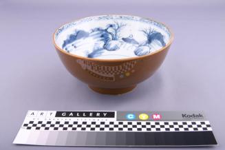 DescriptionBowl has rounded sides on a straight foot. Exterior is a brown glaze, interior is white with blue underglaze design of a landscape scene and geometric band near rim.Colour: brown;blue