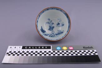 DescriptionBowl has rounded sides on a straight foot. Exterior is a brown glaze, interior is white with blue underglaze design of rocks, trees and buildings with a geometric band near rim.Colour: brown;blue
