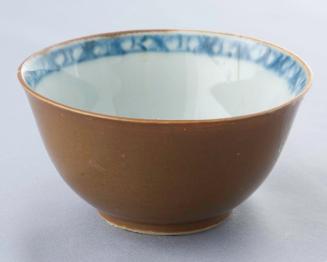 DescriptionBowl has rounded sides on a straight foot. Exterior is a brown glaze, interior is white with blue underglaze design of rocks, trees and buildings with a geometric band near rim.