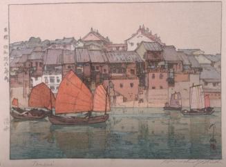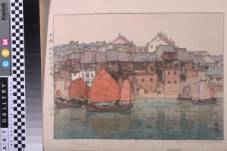 Descriptionwater scene with sailing vessels (sampans) in foreground with a bank of houses in background.Status