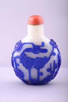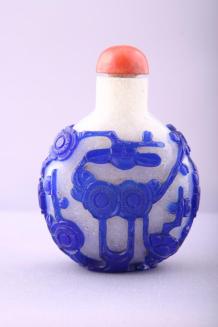 White Glass Snuff Bottle with Blue Overlay Design of Flowers
