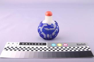 DescriptionBottle is a flattened-rounded shape with a straight neck and a stopper of red dyed wood. There is a blue overlay of a carved floral motif over an opaque white base.Colour: white;blue