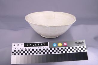 DescriptionWide rimmed bowl has flared sides and four vertical ridges on interior that end at a small indentations on the rim to suggest petal shapes.Status