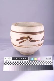 DescriptionDeep bowl with a small foot and rounded sides. Design is in a brown underglaze, consisting of circular rings enclosing a simple leaf work pattern. A transparent overglaze stops short of the foot.Colour: white