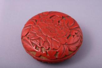 DescriptionLid and bottom of round covered box of carved red lacquer have indentical decoration of large peony surrounded by deeply carved leaves on yellow ground. Interior is blackColour: red;black