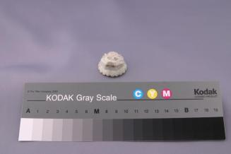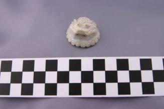 DescriptionCircular button is rounded and carved as a lions head on one side and concave on the other side. Edge is scalloped with an incised curl. There are 3 small perforations on the edge and perforations through the lions mouthStatus