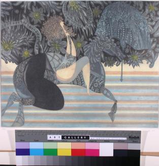 DescriptionImage is a stylized rider on an elaborately patterned horse. Stripes and vegetation with decorative motifs in background.Colour: soft turquoise; yellow; brown; black