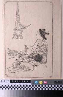 DescriptionBlack and white image of a seated woman in kimono gazing at ikebana. Image is enclosed in a rectangle with swirls at 4 corners.Colour: Black