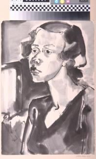 DescriptionBlack and white ink drawing with washes depicts the head and shoulders portrait of a womanColour: black;white