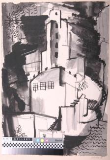 DescriptionBlack and white ink drawing with washes depicting buildings in a landscape with water and treesColour: black;white