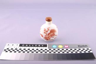 DescriptionCream coloured bottle has a flattened round shape with small foot and straight neck. Two sides have an image in reddish orange of a fo lion dog with ball amid flames. Gold on top edge of neck and wooden stopper with incised flower motif on top.Colour: cream;reddish orange