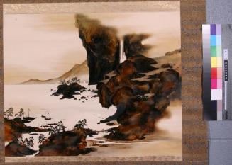 DescriptionCoastal landscape with cliffs and islands. Foreground has several small sailing vessels, huts, people and bridge. Done in tones of brownColour: brown