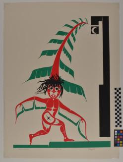DescriptionHuman-like figure with wings and a fir tree on the top of his head. Colours are red, green and black