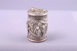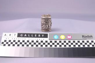 Descriptionlidded; round silver box with cover in high repousse design of a recumbent lion dog with a twisted wire frame, outer border of incised key fret. Main body design of figures in a temple/garden with a background of fine stippling.Status