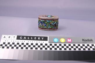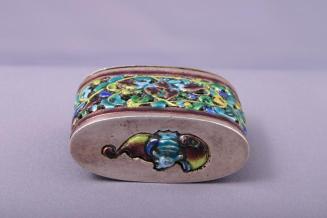DescriptionBox has a blue enamel bat on the lid that fits through an outer sleeve. Sleeve has upper and lower borders of diaper work, side designs of low relief plum blossoms in light and dark blue on pinkish enamel.Status