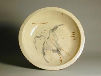 DescriptionLarge shallow dish with creamy crackled glaze, used for serving herring, stew etc., is decorated with freely drawn brush-painting of a crane & reeds in cobalt blue & iron brown.Status