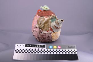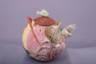 DescriptionTeapot has raised relief design of sea creatures (eg. fish, lobster, crab, shellfish) over entire surface and lid. Knob is a fish and spout is a shellfish. There are 2 loops for handle mounts.Status