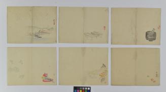 Description41 unbound pages of slightly differing sizes. Each page is creased in the centre with an image on one side. Images are all different and of varying subject matter.