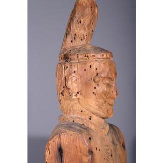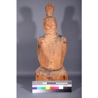 DescriptionHead and torso of a deity wearing an eboshi and with a low relief collar at base of neck, with hair in a top knot and arms missing; undecoratedStatus