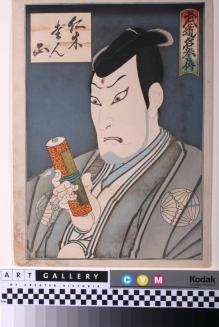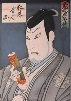 Descriptionportrait of an actor with a sword wound on his forehead holding a scroll and grimacing; scene from the play Meiboku sendai hagi (Nikki Danjo turns into a rat to steal the scroll)Status