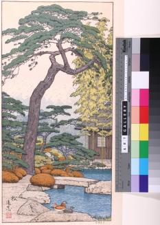 DescriptionPine tree in a formal garden with a hut and bamboo and snowy mountains in background. Water and ducks in foreground.