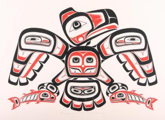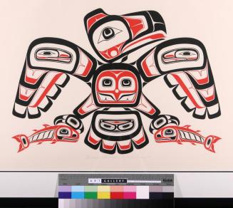 DescriptionPrint depicts and eagle with its wings open on either side and salmon in talons of both feet. Red and BlackColour: red;black