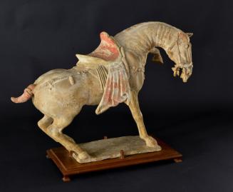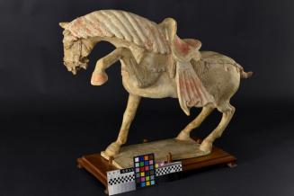 DescriptionStanding figure of prancing horse with left proper leg raised and head bent slightly to R proper. There is saddle on its back. Remains of red paint on saddle, tail, hooves and head harness. Some white paint remains overall. Figure is attached to a wooden base.Status