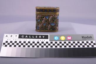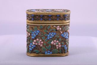 DescriptionLidded oblong brass box has rounded sides decorated in cloissone enamels in an all over design of flowers against a metal background. There are peonies on one side and the lid, and Chrysanthemums on the other side. There is a cloud collar band on the lower edge of the lid. The body is predominantly pink, blue and green with blue on the base and interior.