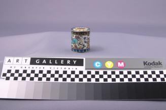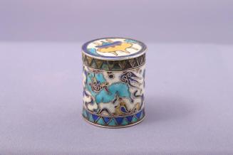 DescriptionCylindrical box has a deep fitting lid and is decorated with cloisonnÚ motifs of lion dogs on the body and a tripod incense burner on the lid. Enamels are in blues, yellow and pale purple. The lower edge of the body and the lid have sawtooth bands.Status