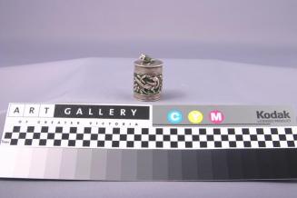 DescriptionCylincrical shaped box with fitted lid. Highly raised relief of frog with some enamel, on lid. Sides of the box have a raised relief of birds and flowers with a green enamel background. Lower lid and lower body of box have a band of twisted wires and a band of incised key frets.Status