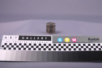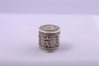 DescriptionSmall plain cylindrical silver box with fitted lid and incised outer sleeve. Outer sleeve is decorated with a raised design of prunus branches and chinese characters in relief against a beaded background, with upper and lower borders of raised twisted wires and a band of cross-hatching.Status