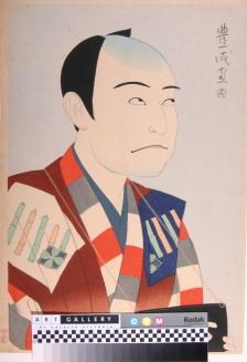 DescriptionHead and shoulders image of a male actor. Bando Mitsugoro VII is in the role of the Mute in "Sannin-Katawa" (Three disabled Persons). He is showing a card indicating he is "oshi" (mute)