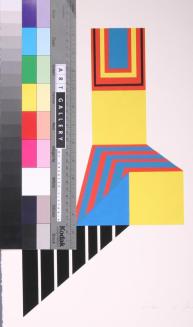 Descriptiongeometric hard edge composition: series of parallel bands of colour. Cut diagonally across TRC and a square cut out on TLC.Colour: silver;green;orange