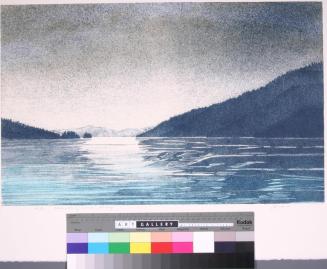 Descriptionlandscape/seascape in blue, large expanse of water and sky with land masses at centreColour: blue;beige