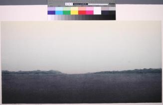 Descriptionminimalist seascape with large expanse of sky and water and a narrow strip of land in centreColour: black;yellow-purple