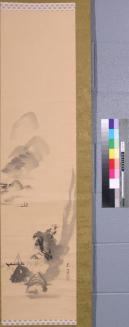 Descriptiona haboku (broken ink) landscape with suggestion a fishing boat moored in front of two thatched cottage, with a third roof emerging from reeds, with trees and a cliff to right; background with a boat on a lake, with a hilly far shore backed by three rounded mountain peaks.Colour: black;white