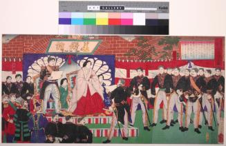 Descriptiontriptych; Image of the Emperor and Empress on a podium surrounded by family, ambassadors and foreign dignitaries. The Empress is seated and the Emperor is standing giving a speech.Status