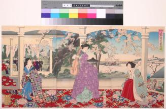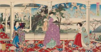 Descriptiontriptych; Three ladies, one in western dress and holding a violin and two in traditional Japanese dress, are in a building with a view of cherry trees in blossom and a pavillion with a dance in progress. Dancers are in western dress.