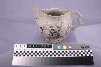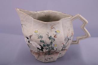 DescriptionEight sided jug decorated with coloured cranes, flowers, and water in enamel glaze on grey ceramicStatus