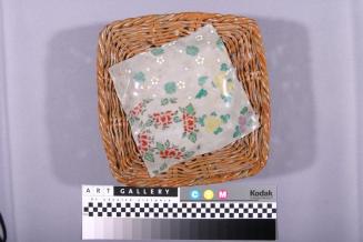 Descriptionbasket shaped dish; square, grey ceramic with enamel colours; flowers and geometric design on serviette