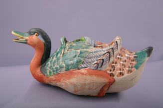 DescriptionDuck shaped teapot with raised relief iris on one side. Wicker and wire handleColour: green;brown;blue;black;white;gold