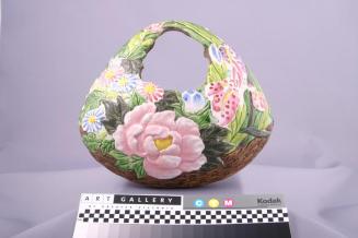 DescriptionBasket shaped vase with handle, with relief floral designs (peony, daisies, iris etc.) on both sidesColour: green;brown;pink;blue;yellow;purple;red