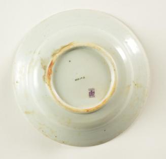 DescriptionCircular dish with central circular indentation decoratied with a peony and other smaller botanical details.