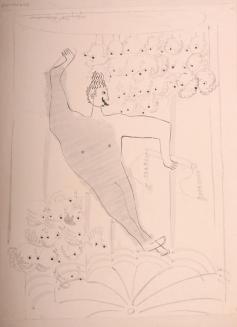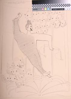 DescriptionBlack and white ink drawing with washes depicts the upside down image of a man on a trapeze with an audience at TR and BL looking on.Colour: black;white
