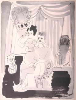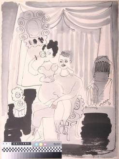 DescriptionBlack and white ink drawing with washes portrays seated male circus figure with a woman on his lapColour: black;white
