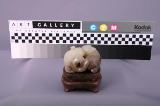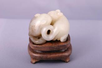 DescriptionFigure portrays two cats curled up together with heads at centre. White jade with dark brown intrusions.Status
