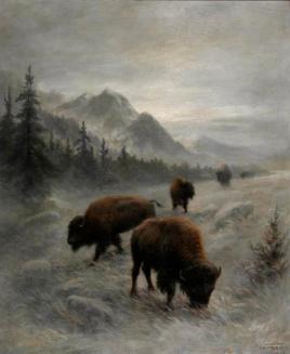 DescriptionLandscape with buffalo grazing in the foothills below mountains with snowy peaks and forests.Status