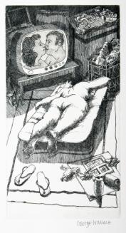 DescriptionFrom a portfolio of 12 etchings entitled Summer Shadows, Summer Dreams; a nude woman lying on her front on a cot, watching a man and a woman kissing on TV. On the floor are a pair of thongs, an eaten TV dinner, pop cans and beside the TV are several boxes.Colour: black; white