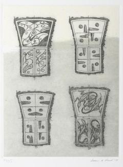 DescriptionFour 'copper' shapes with decorative motifs, in black ink and with chine-collÚ background in grey and creamColour: black; grey; cream